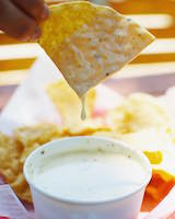 If you’re a queso purist, head to Tacodeli (right) for light, creamy cheese with no add-ins. This rapidly growing local chain upgraded their chips a few months back and now use sturdy, crisp organic corn chips. We recommend mixing in a bit of the Salsa Doña, Tacodeli’s signature jalapeño garlic salsa, for an even more crave-worthy depth of flavor.