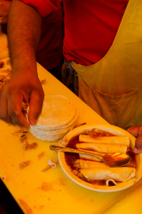 At David’s taco stand (right) in the city of Veracruz, a gaggle of servers and cooks fill the space behind the tiny outdoor kitchen. An old man plays a makeshift drum and harmonica while diners are served tightly rolled pulled-pork tacos with a cochinita broth poured on top. Cochinita tacos are a breakfast food in the port. The flavor is light, subtle and delicious, but nothing like Sylvia’s.