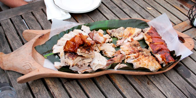 Roth grills and serves his yellowtail snapper like no one else. He rubs it down with fresh ground chilies, mustard powder, and ginger. He grills it whole and serves it scored on a smooth slab of cedar with juicy pineapple salsa, a side a spicy green papaya salad, and piping hot Puerto Rican arepas.