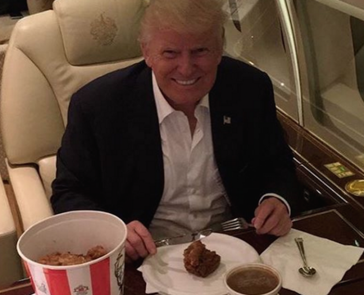 The Republican nominee is on a quest to appeal to mass America by indulging in fast food favorites. First, Trump attempted to appeal to Latinos on Cinco de Mayo by posing with a taco bowl. Now, he’s pictured with a bucket of Kentucky Fried Chicken.