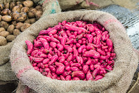 The vividly colored tubers fit well into Colombia’s most colorful market where Guambiano people gather to trade their goods. They are the only indigenous group in Colombia that continues wearing its traditional dress: black skirts topped with a purple/blue blanket around the shoulder. Some use this blanket as a wrap-around skirt, including men. Most men wear a blouse with a short poncho and a bowler hat.
