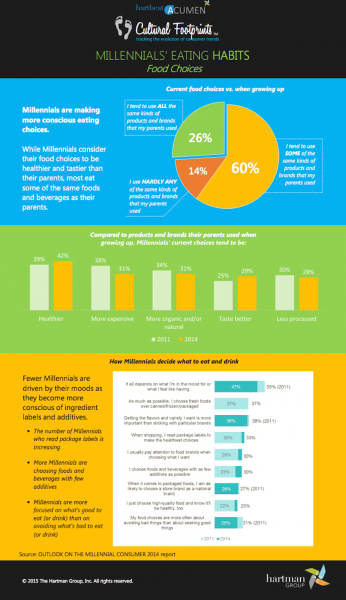 While most non-millenials are influenced by their parents and their upbringing when making food choices, 60% of millennials say they use only some of the products and brands their families use. Additionally, studies show that millennials are more focused on organic and less-processed foods.